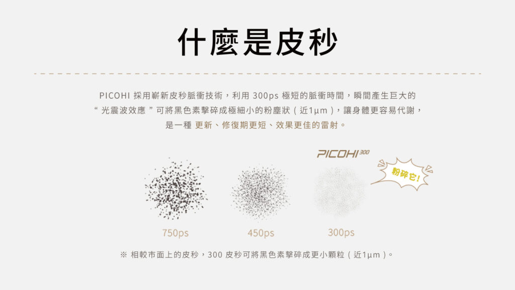 PICOHI 300 採用 300ps 脈衝時間,在理論上能於更短時間內作用於色素顆粒。