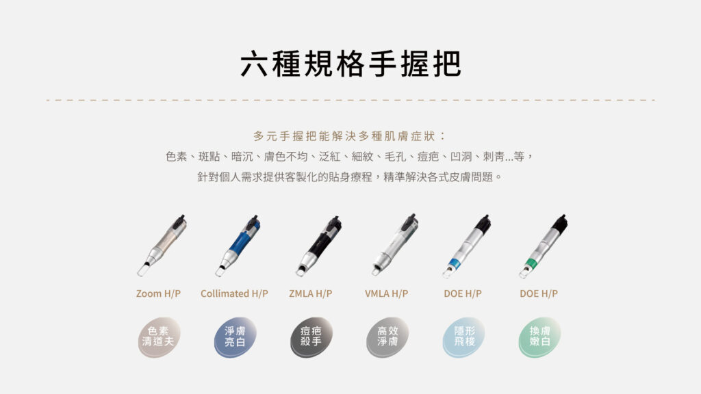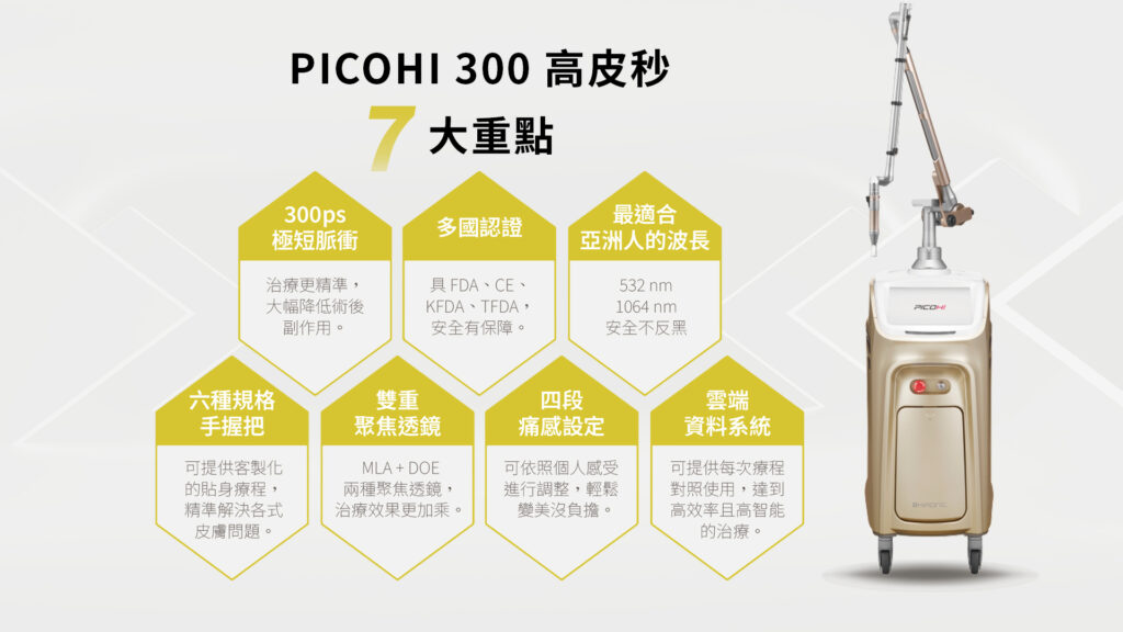 其中 PICOHI 300 高皮秒(衛部醫器輸字第 034556 號) 主打 300ps 脈衝時間與雙聚焦透鏡技術,強調在短脈衝時間內產生光震波效應。